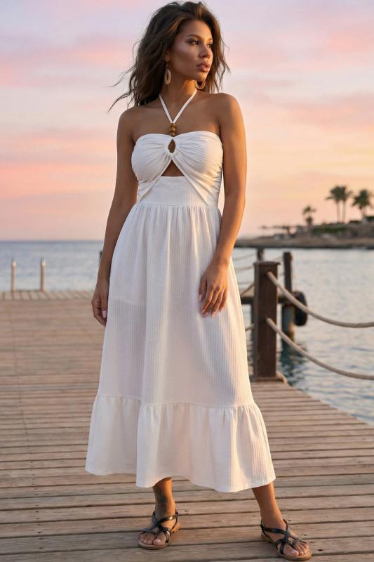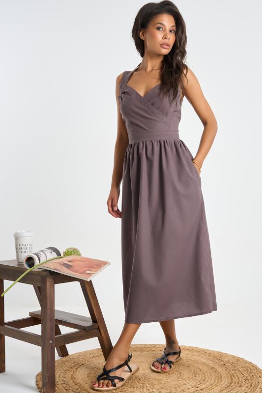 • Особенности: Сарафан полуприлегающего силуэта из фактурного высококачественного трикотажа. Лиф переда и спинка собраны на завязки, отделочные бусины формируют узел на груди и крест на спинке, в боковых швах карманы. В лиф переда вложены чашечки.