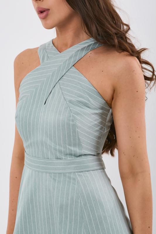• Особенности: Сарафан полуприлегающего силуэта . Лиф переда двойной перекрещен через шею, пояс на спинке притачной, спереди отлетной застегивается на пришивную кнопку, в боковых швах карманы. Застежка на молнию в среднем шве спинки.