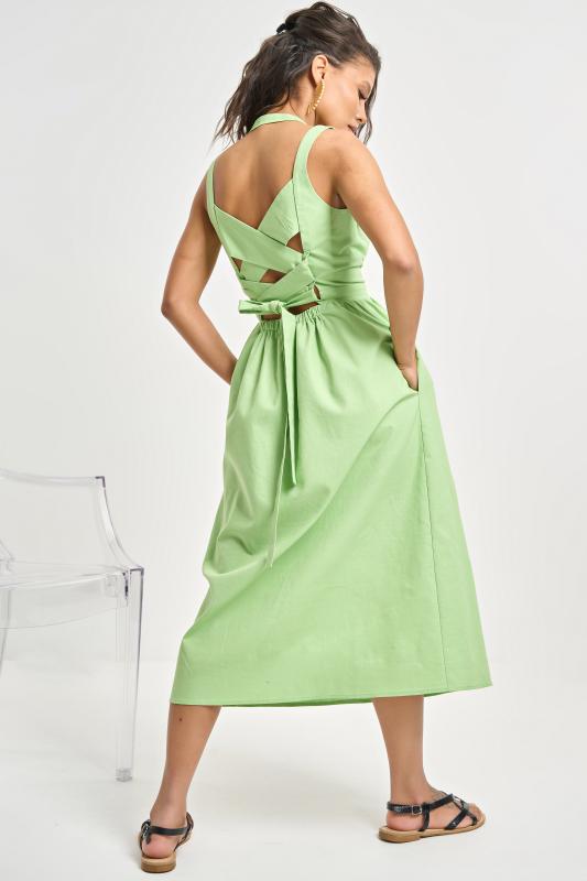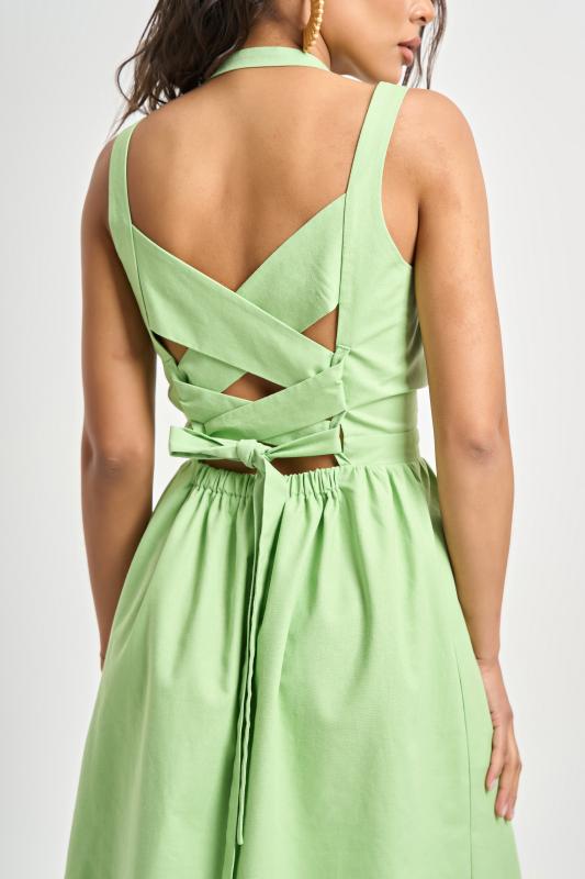 • Особенности: Сарафан прилегающего силуэта из хлопковой ткани. Детали: открытая спина, небольшой участок бретели собран на резину, бретели перекрещиваются на спине, в переднем шве юбки выполнен разрез. Застежка на молнию в среднем шве спинки.