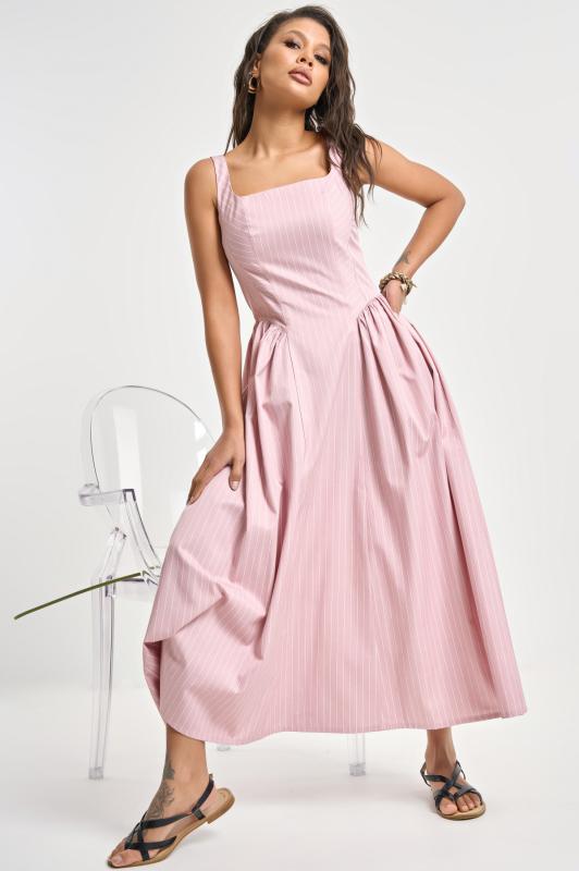 • Особенности: Сарафан прилегающего силуэта на тонких бретелях с регуляторами на подкладке. Талия подчеркнута корсетными линиями и объемной юбкой, в боковых швах карманы. Застежка на молнию в среднем шве спинки.