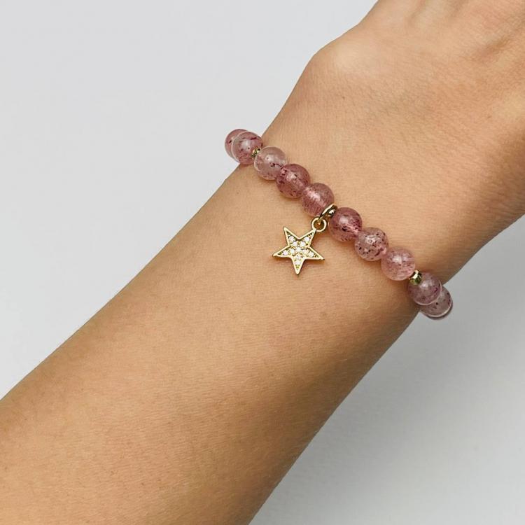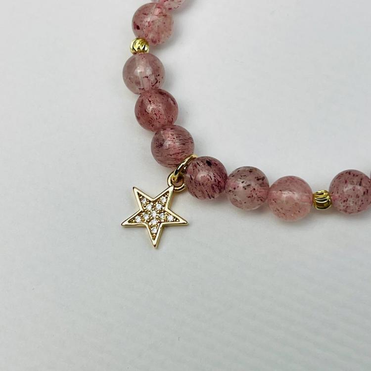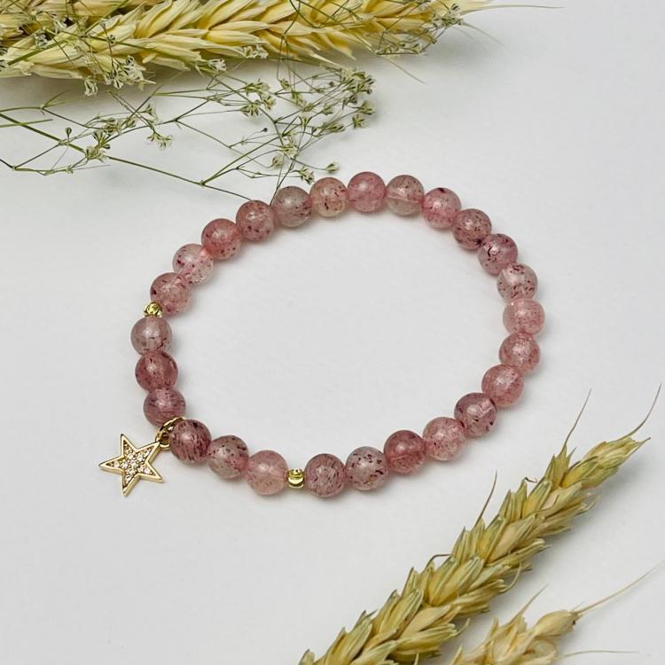 Браслет из Клубничного кварца с подвеской "Звезда", 16 см – 17 см, 6 мм, гладкий, Бразилия