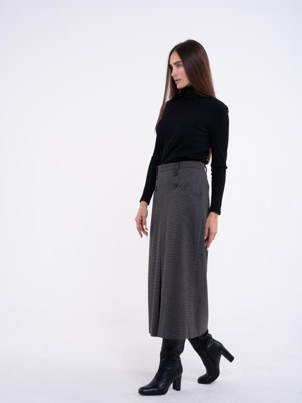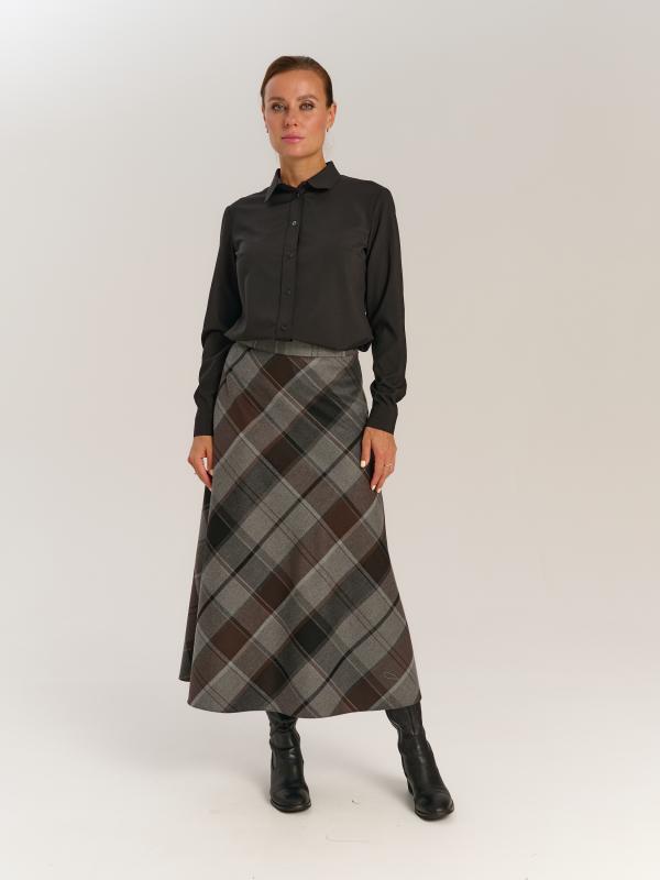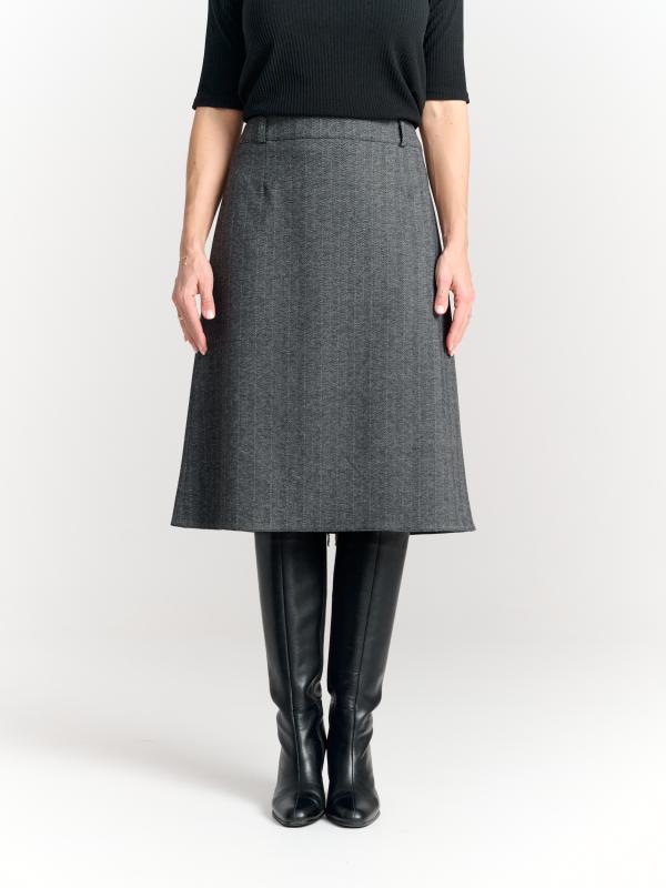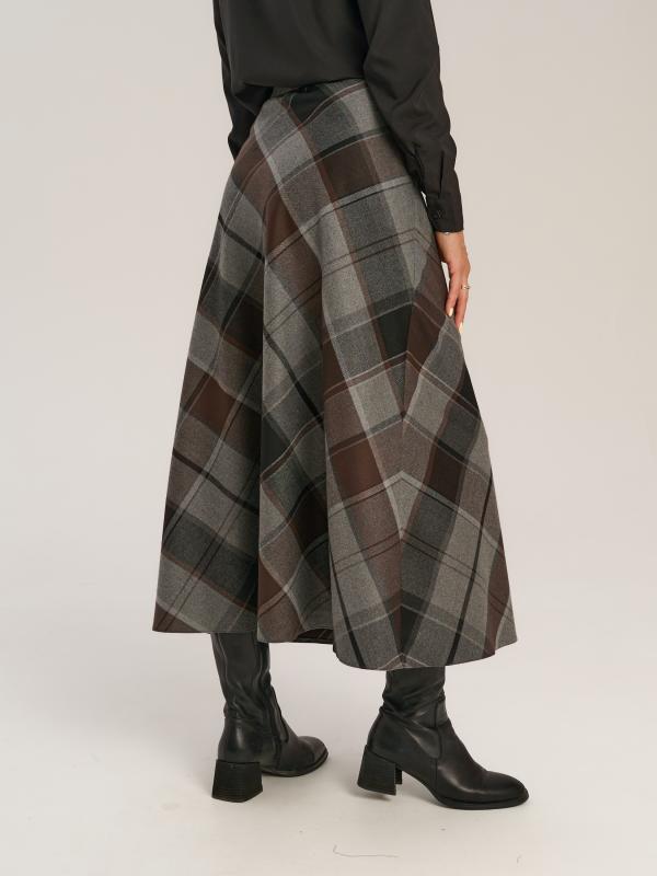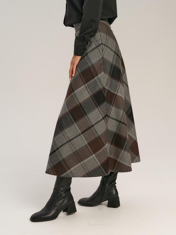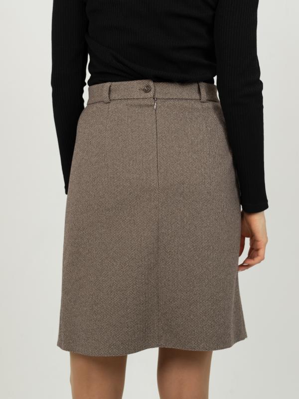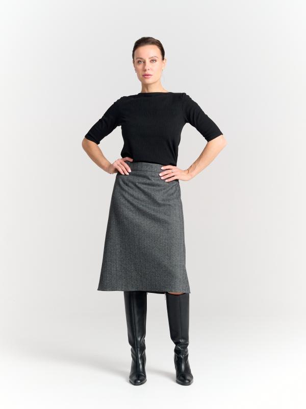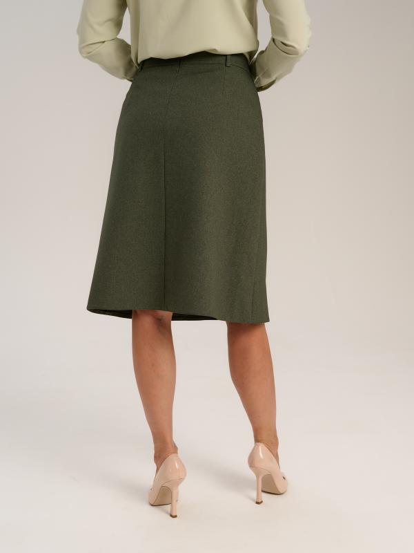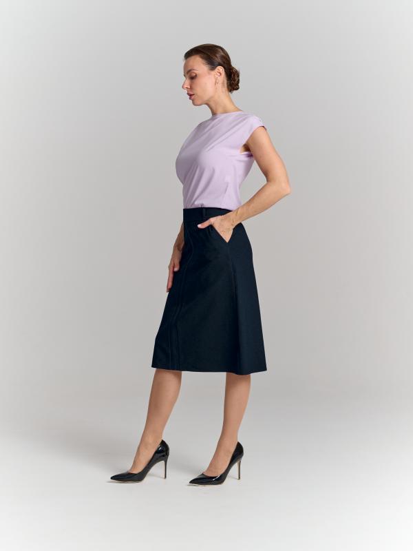 Женская юбка, расклешенная от пояса к низу, на подкладке с притачным поясом. Застежка расположена слева по боковому шву на потайную тесьму молнию и закрепляется пуговицей. Станет отличным дополнением базового осенне-весеннего гардероба.