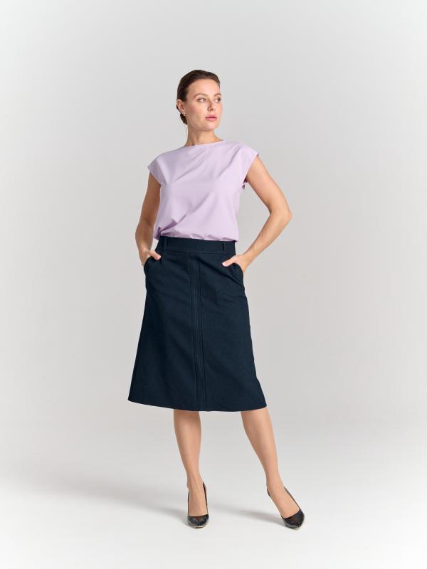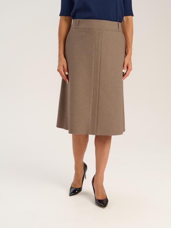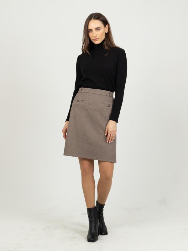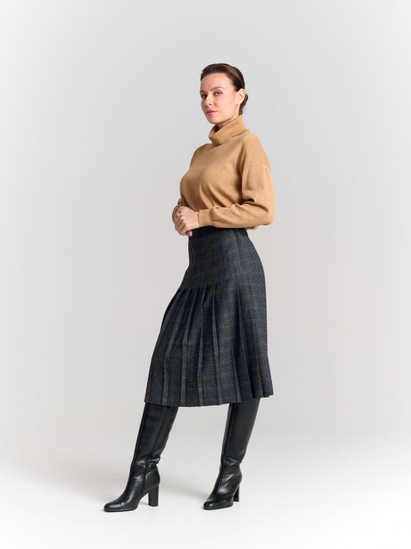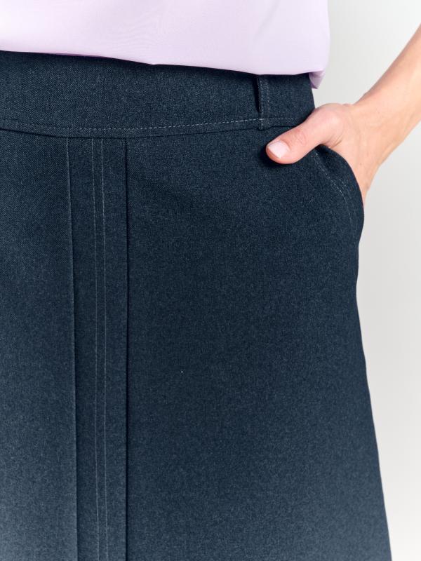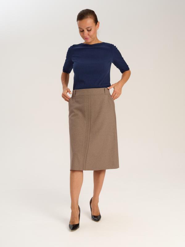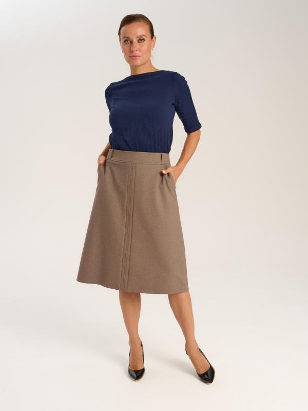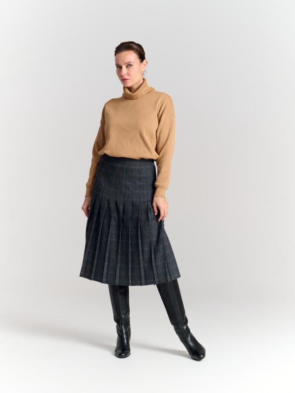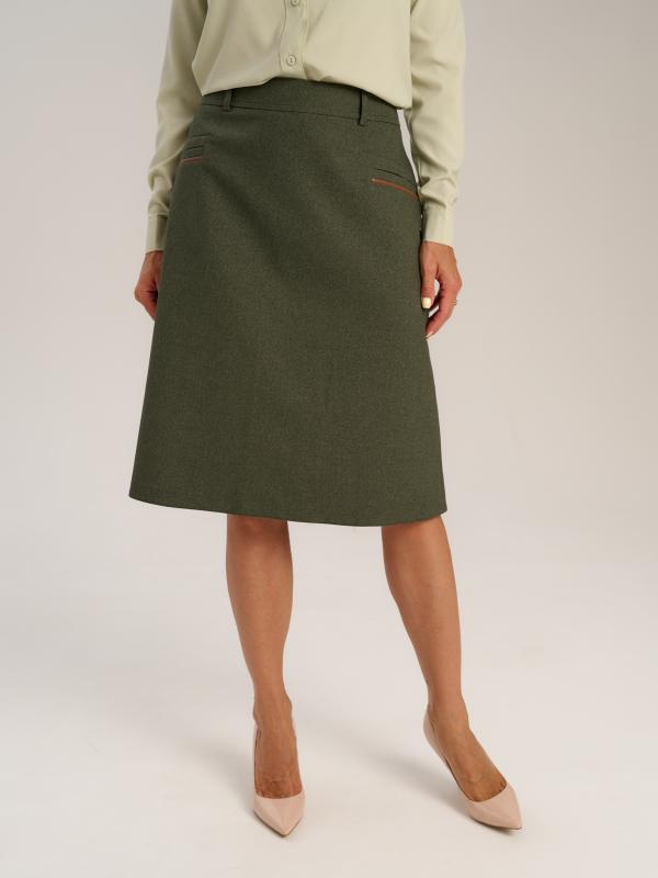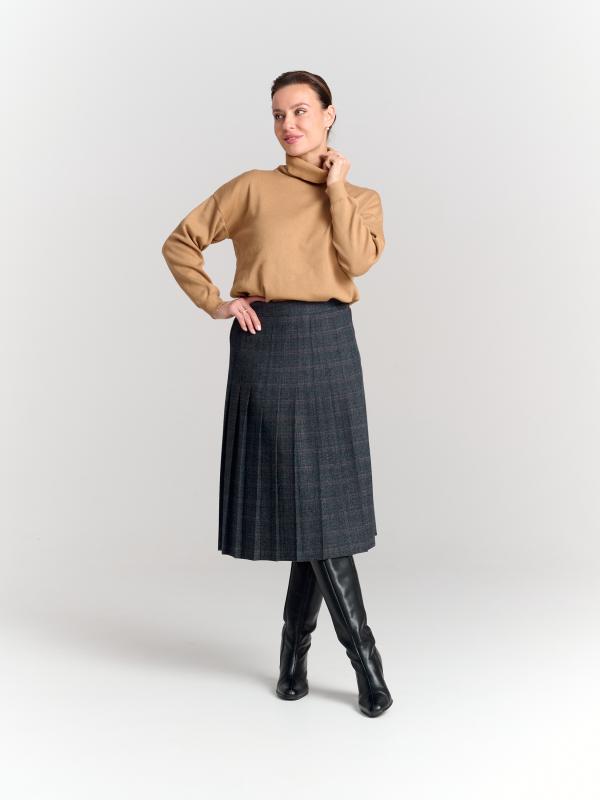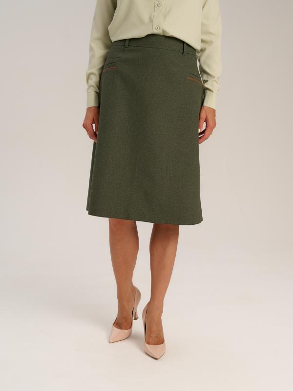 Женская теплая юбка А-силуэта, на подкладке, с притачным поясом на шлевках. Застежка расположена сзади по среднему шву на потайную тесьму молнию. По бокам полноценные функциональные и очень удобные карманы, спереди по среднему шву веерная складка.