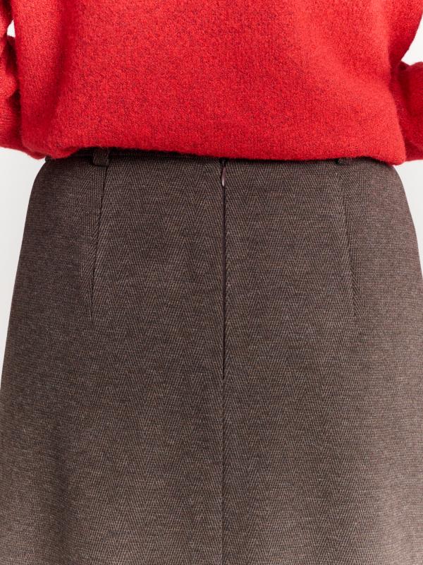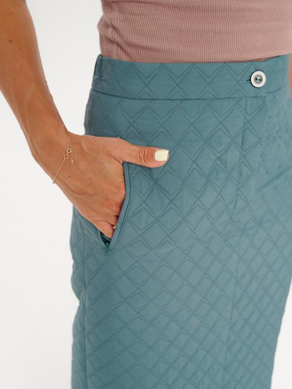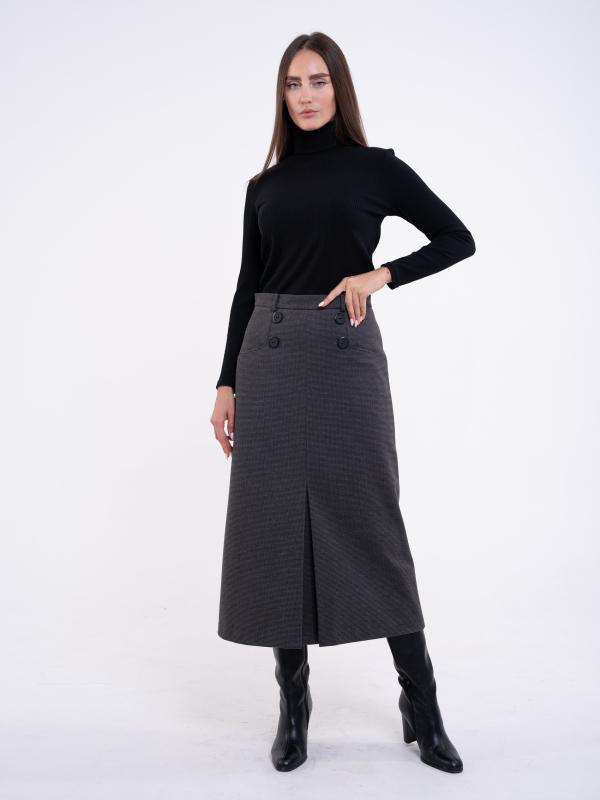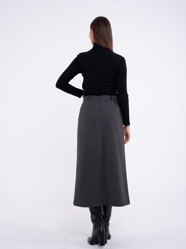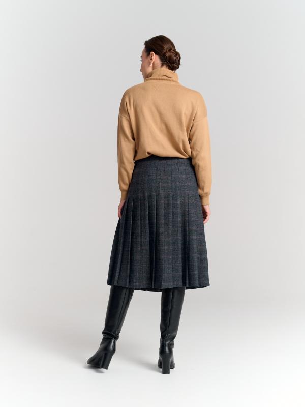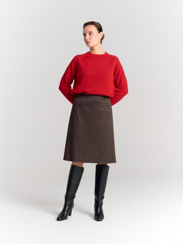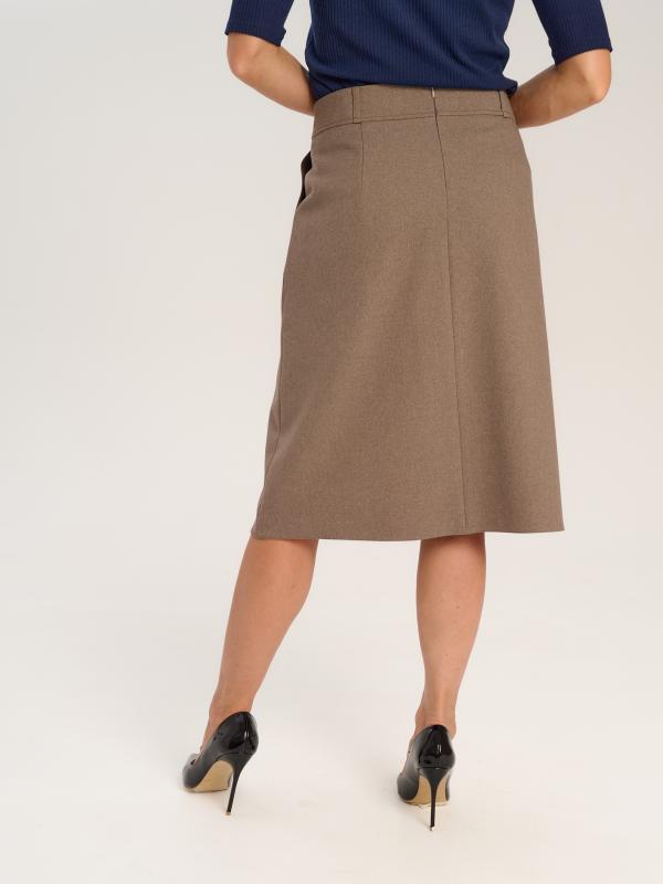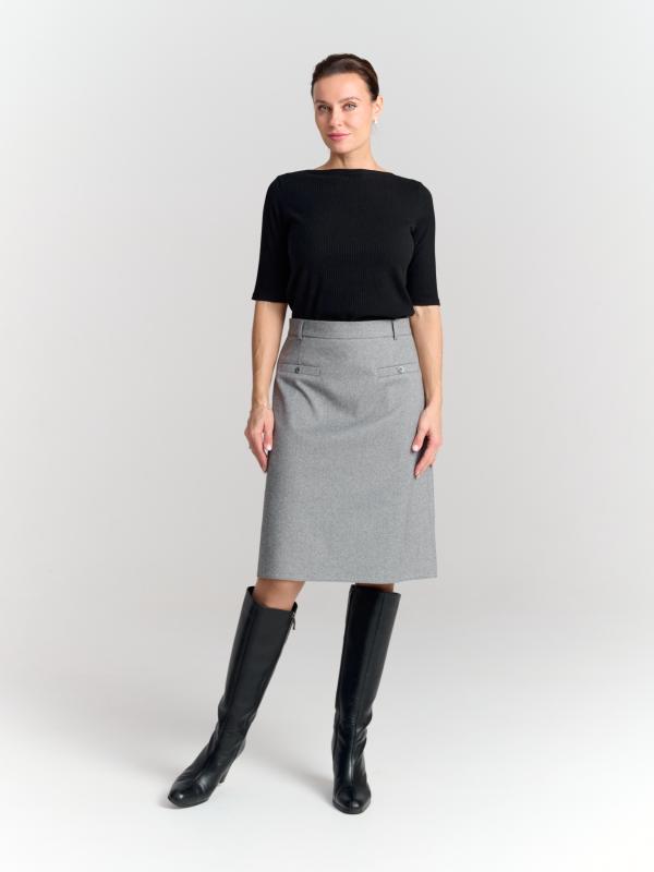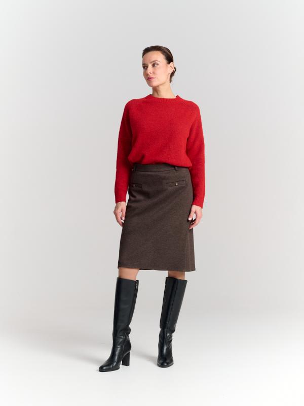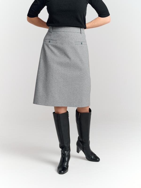 Женская теплая юбка А-силуэта, на подкладке, с притачным поясом на шлевках. Застежка расположена сзади по среднему шву на потайную тесьму молнию. По бокам полноценные функциональные и очень удобные карманы, спереди по среднему шву веерная складка.
