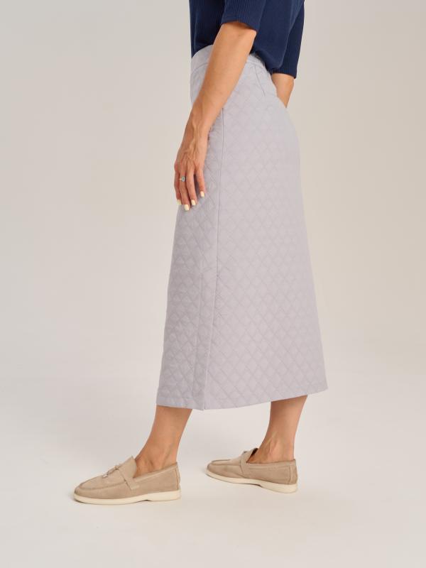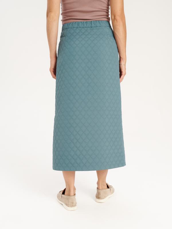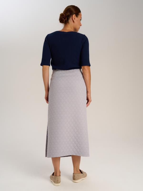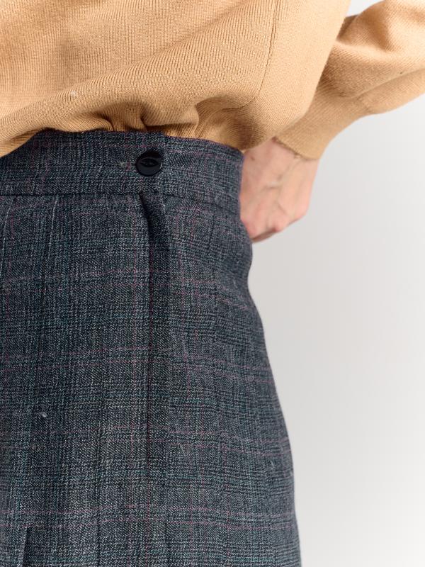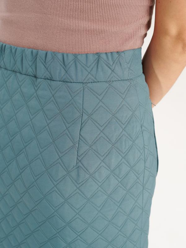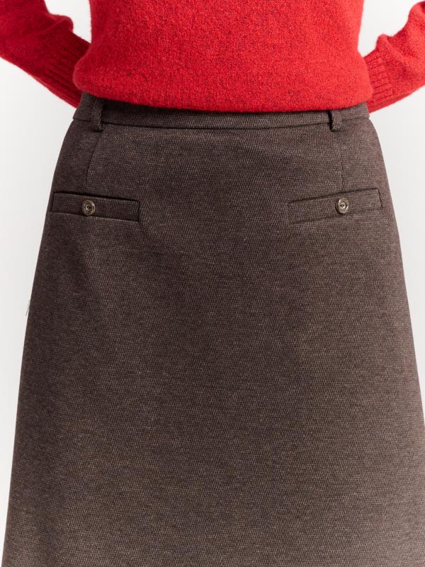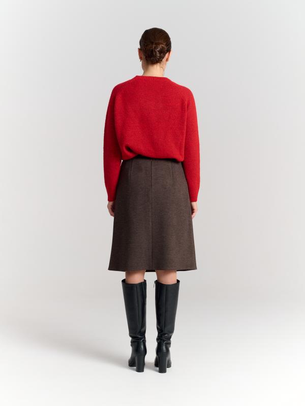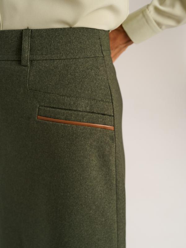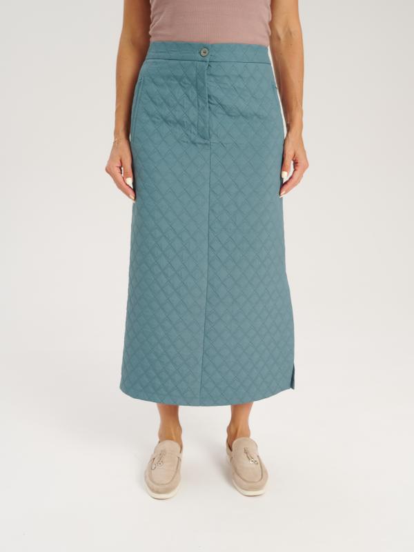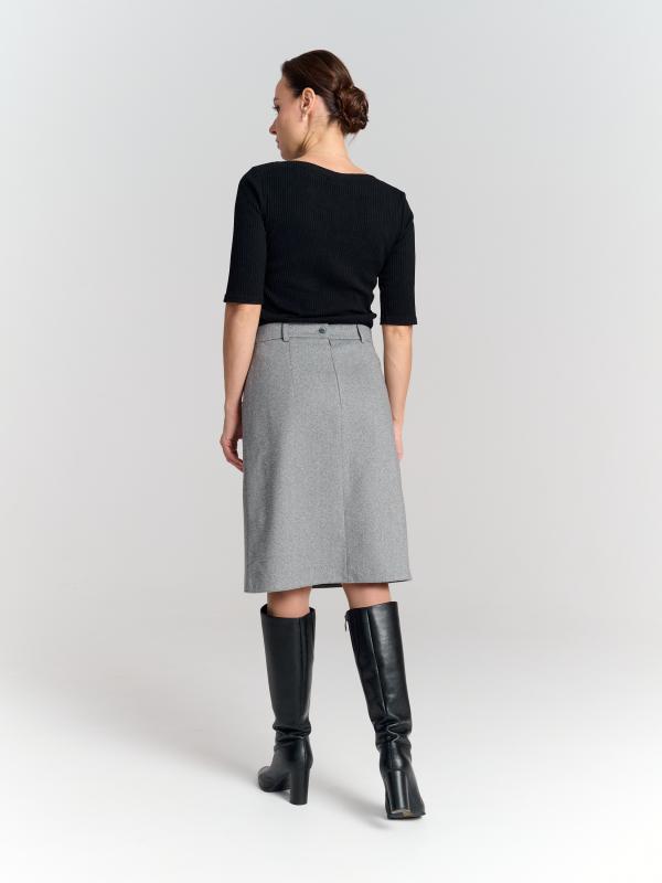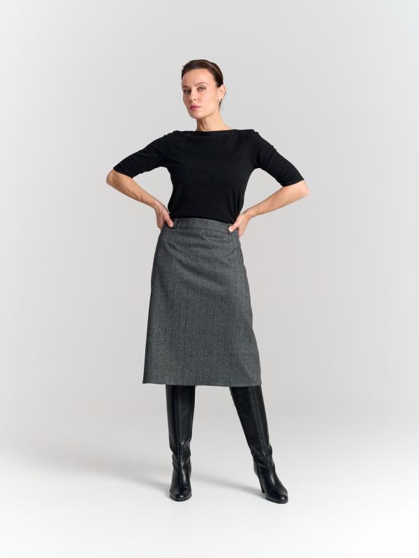 Женская теплая юбка А-силуэта, на подкладке, с притачным поясом на шлевках. Застежка расположена сзади по среднему шву на потайную тесьму молнию. По бокам полноценные функциональные и очень удобные карманы, спереди по среднему шву веерная складка.