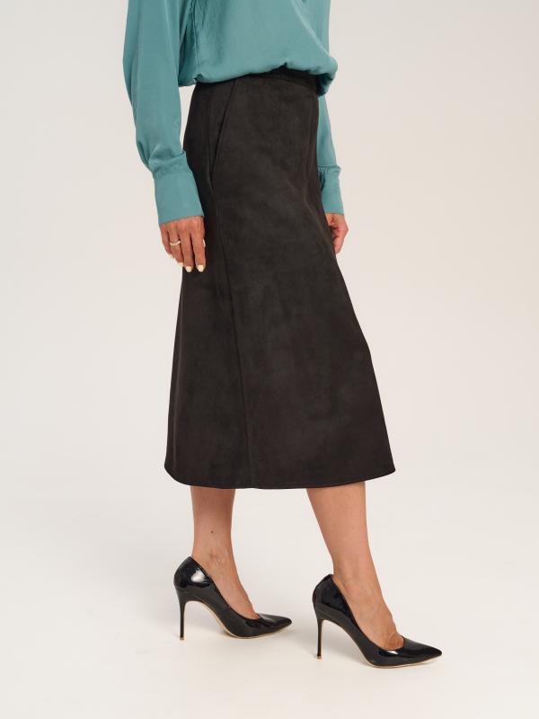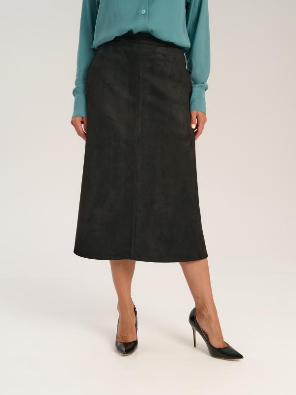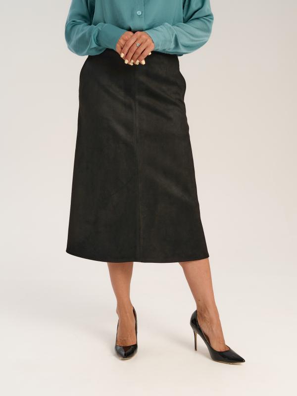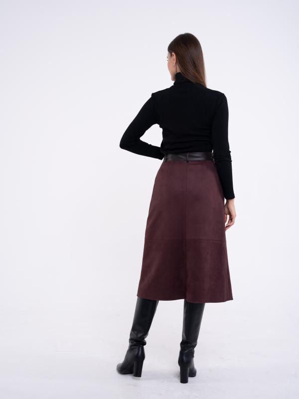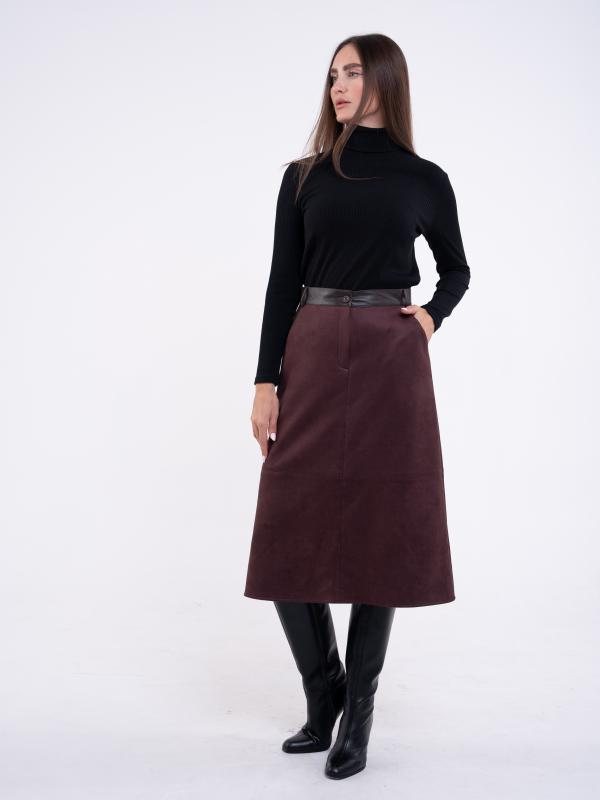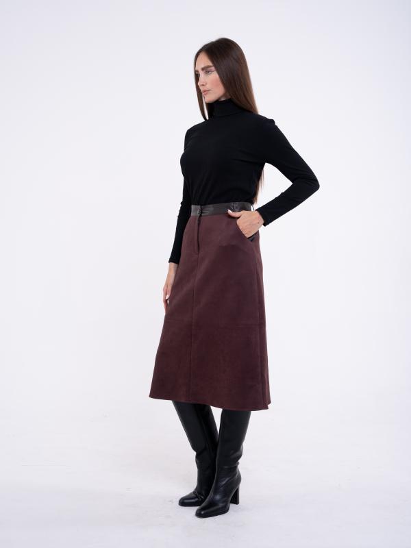 Женская юбка А-силуэта на обтачном поясе с подкладкой, выполнена из мягкой тактильной ткани имитирующей замш, спереди по верху закреплены две декоративные пряжки. Застежка расположена сзади по среднему шву на потайную тесьму молнию. Прекрасный вариант элегантной расцветки, с идеальной посадкой. По бокам функциональные карманы.