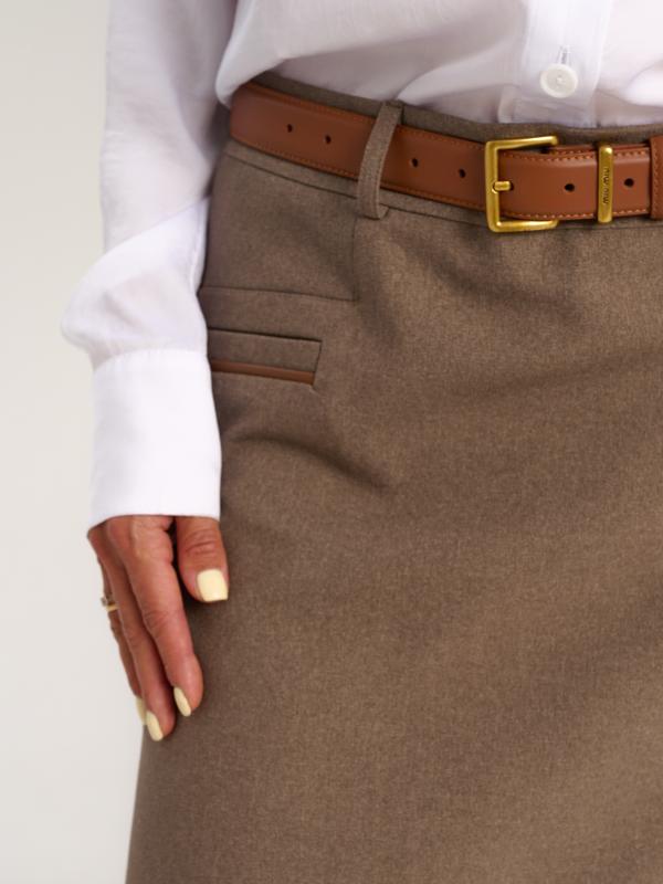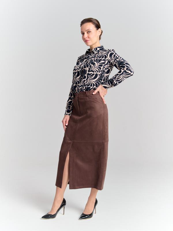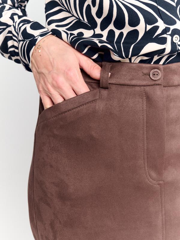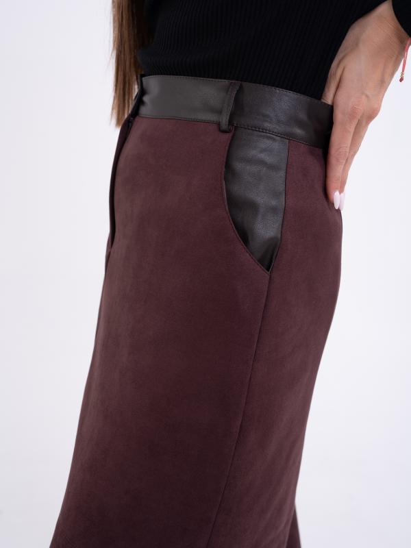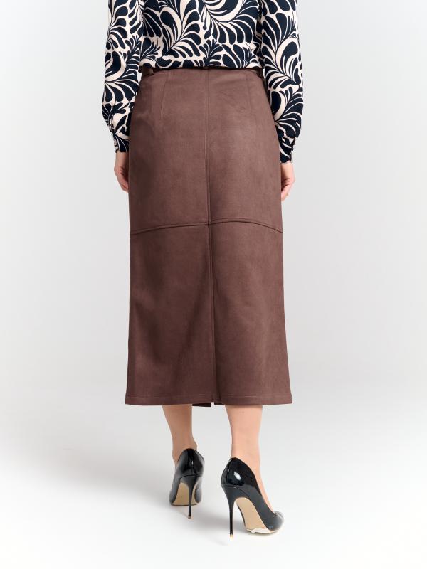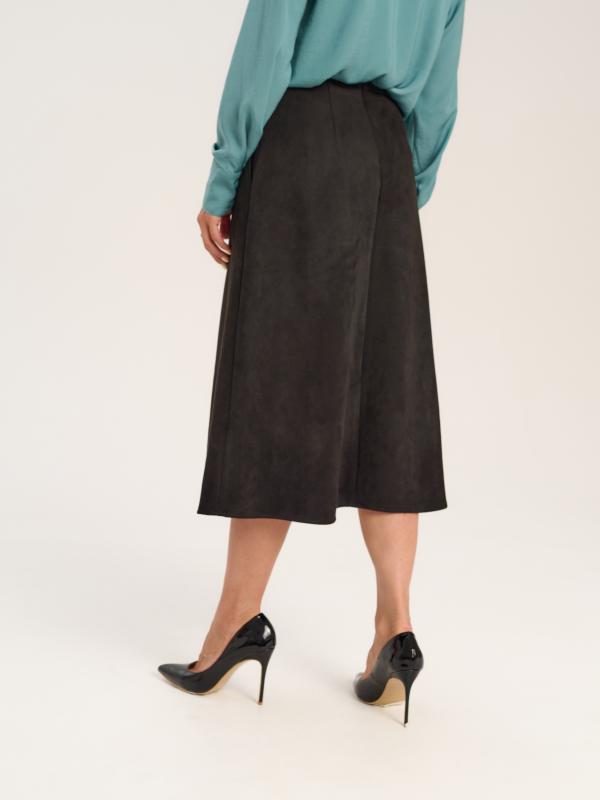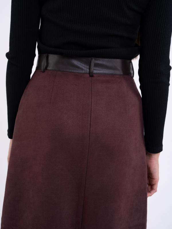 Женская юбка А-силуэта на обтачном поясе с подкладкой, выполнена из мягкой тактильной ткани имитирующей замш, спереди по верху закреплены две декоративные пряжки. Застежка расположена сзади по среднему шву на потайную тесьму молнию. Прекрасный вариант элегантной расцветки, с идеальной посадкой. По бокам функциональные карманы.