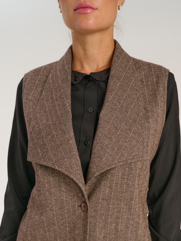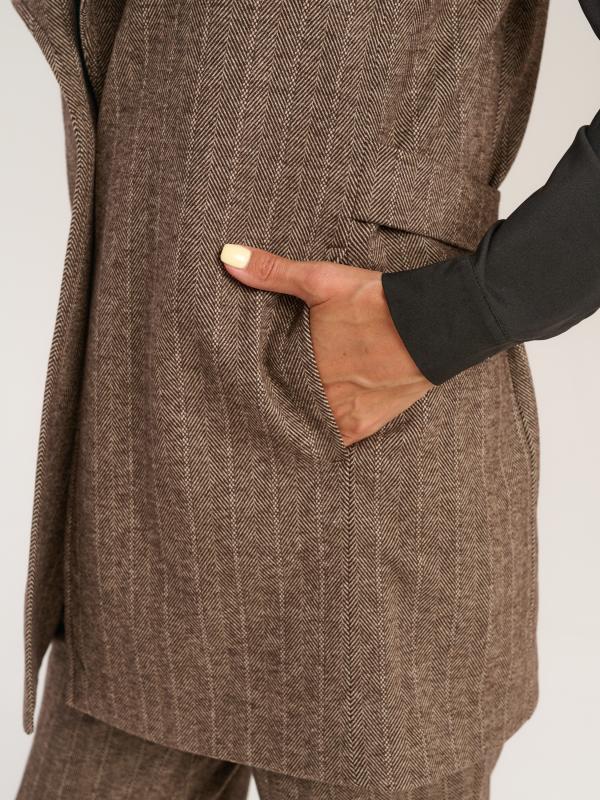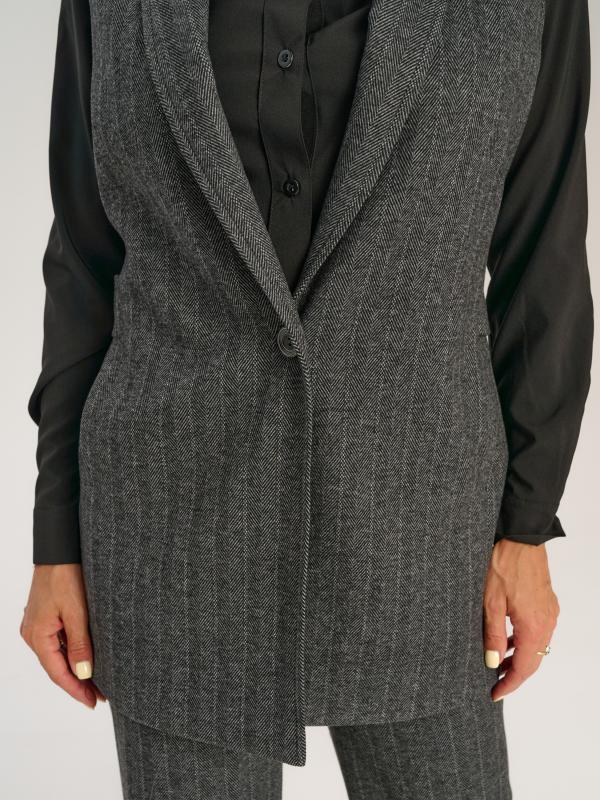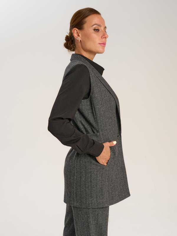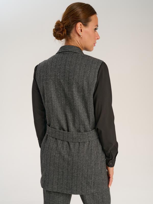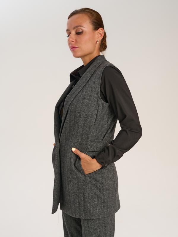 Женский удлиненный жилет, приталенный сзади длинным хлястиком, закрепленным в боковых рельефах переда . По бокам расположены функциональные карманы, застежка находится спереди и закрепляется на 1 пуговицу. Прекрасный базовый вариант для повседневной носки. Отлично сочетается с юбками и брюками любого формата.
