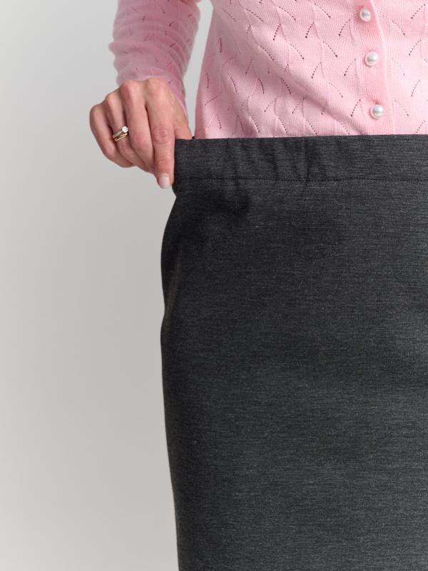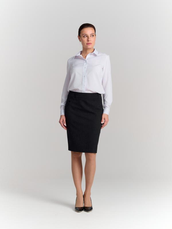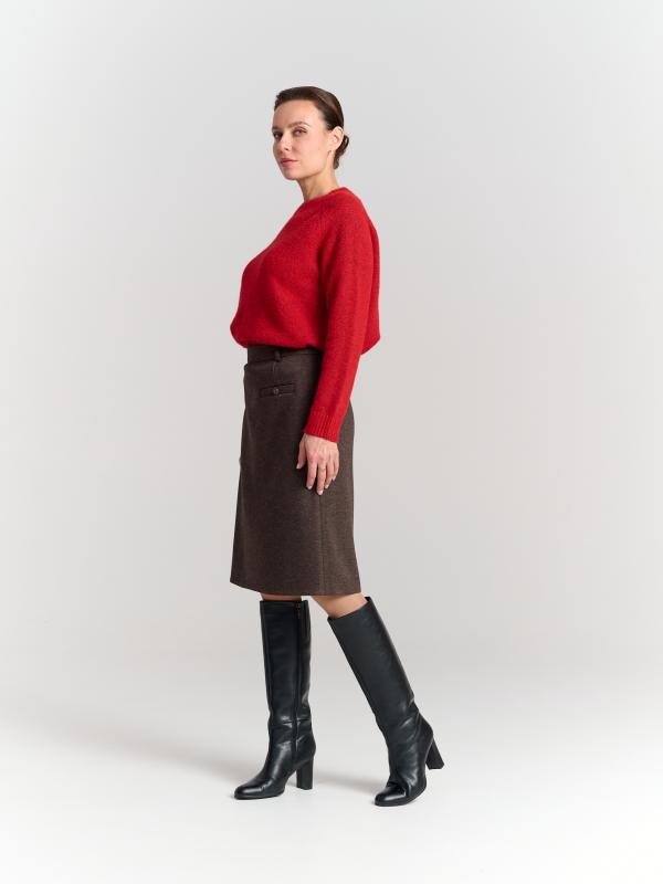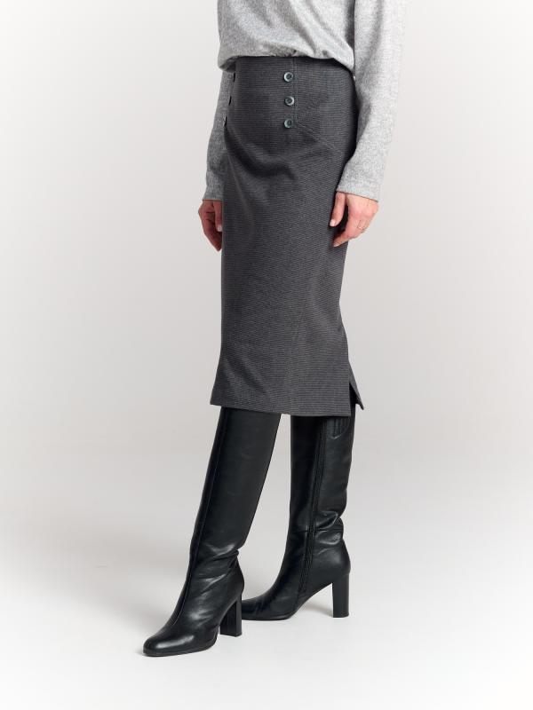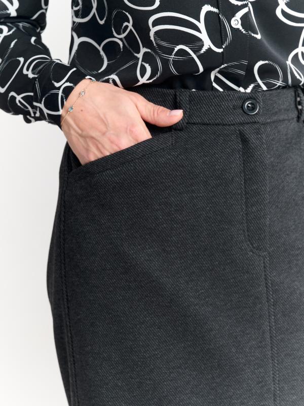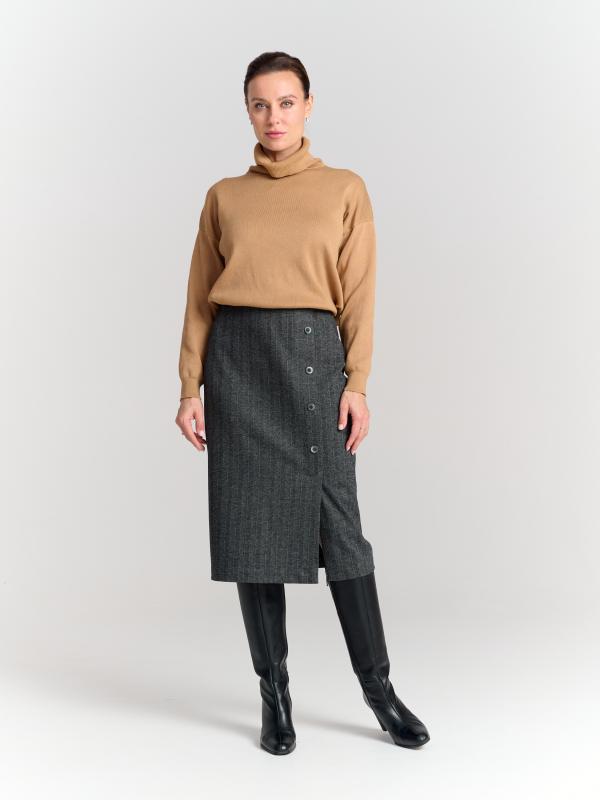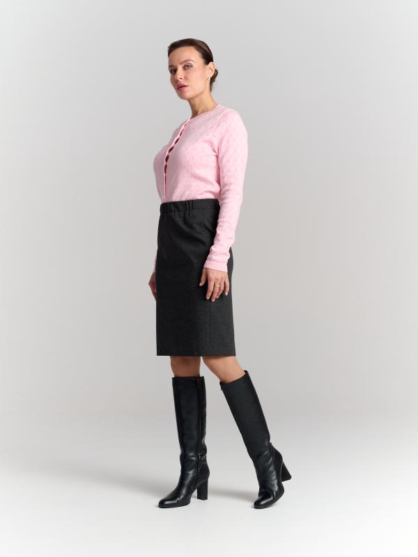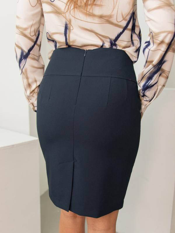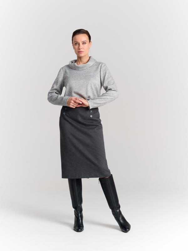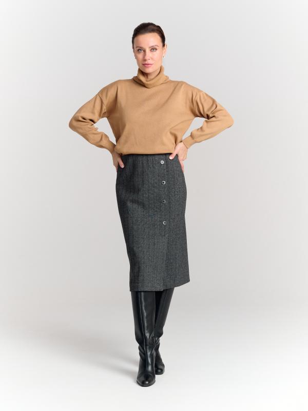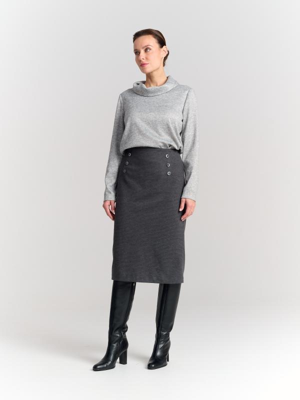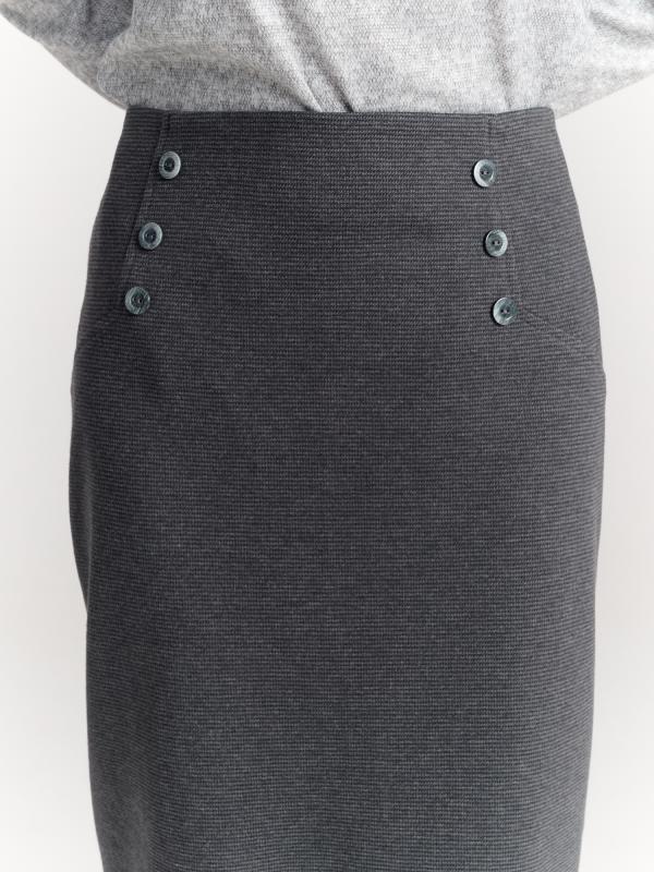 Женская юбка прямого силуэта, зауженная к низу, на подкладке, с обтачным поясом. Застежка расположена сзади по среднему шву на потайную тесьму молнию. Прекрасный вариант теплой юбки, сочетающий в себе фигурные рельефы по бокам, декорированные пуговицами.