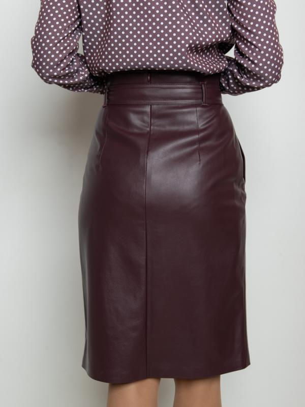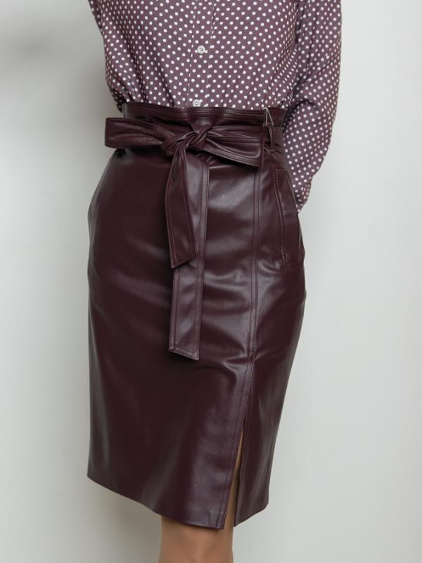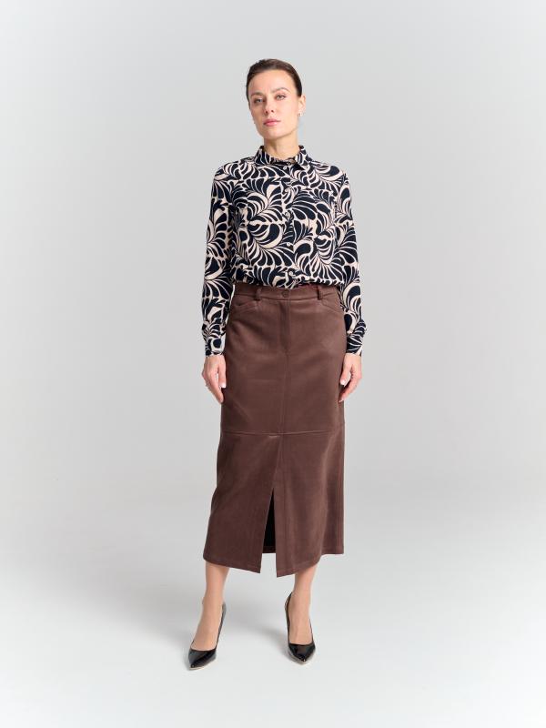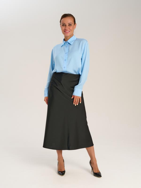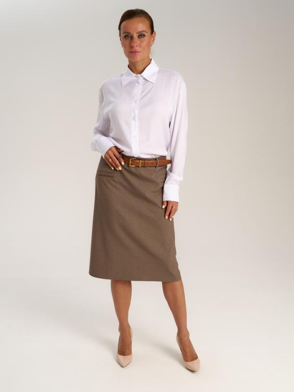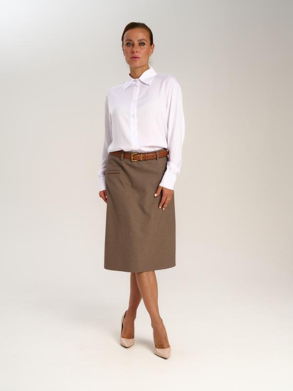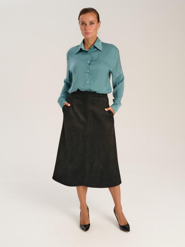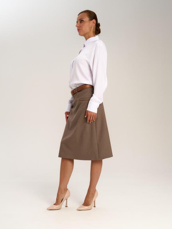 Женская юбка расклешенная от пояса к низу, на подкладке с обтачным поясом на шлевках. Застежка расположена сзади по среднему по шву на потайную тесьму молнию. Спереди по бокам расположены контрастные декоративные карманы из экокожи.Рубашка арт.1120-1118