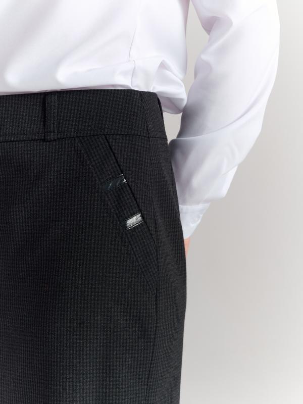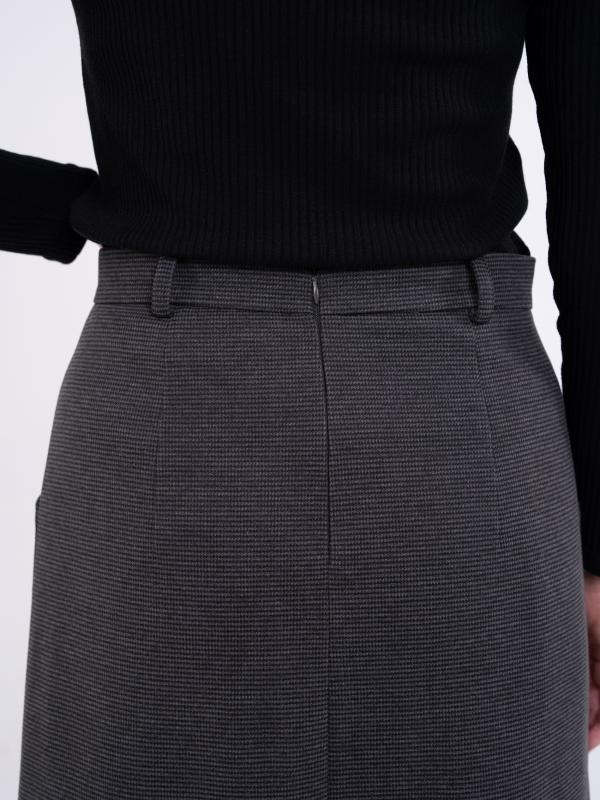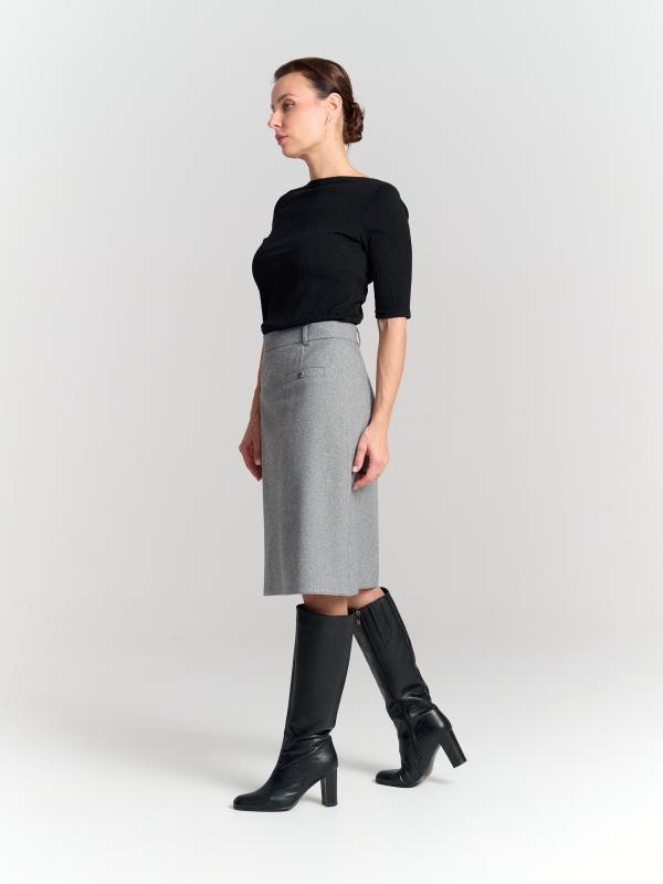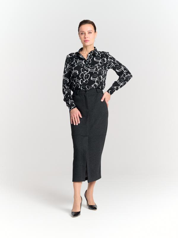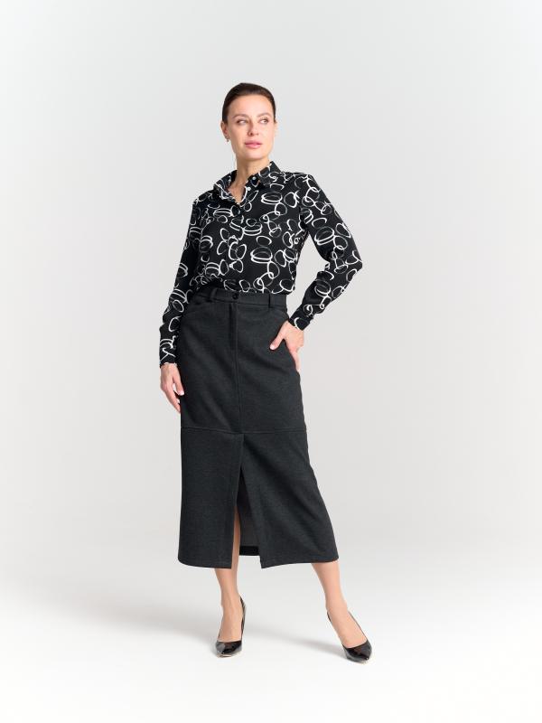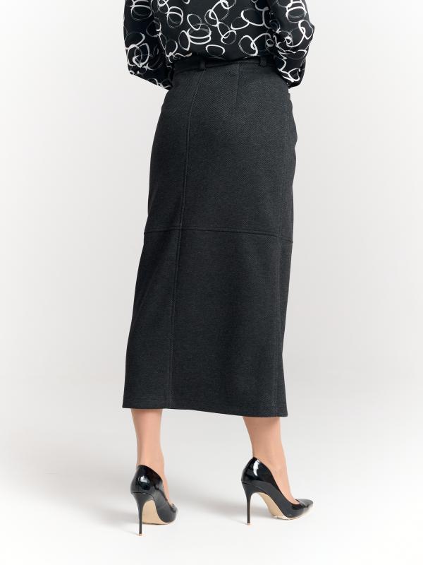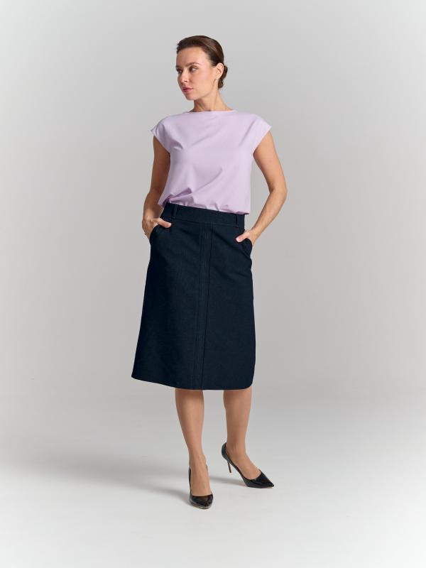 Женская юбка прямого силуэта, с обтачным поясом на подкладке. Застежка расположена сзади по среднему шву на потайную тесьму молнию. Данная модель с шлевками под ремень и декоративными рамками по переду.