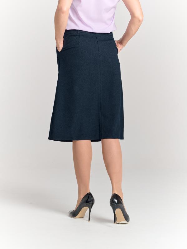 Женская юбка расклешенная от пояса к низу, на подкладке, с обтачным поясом и шлевками. Застежка расположена сзади по среднему по шву на потайную тесьму молнию. Спереди по бокам и центру вставки декорированные отстрочками.