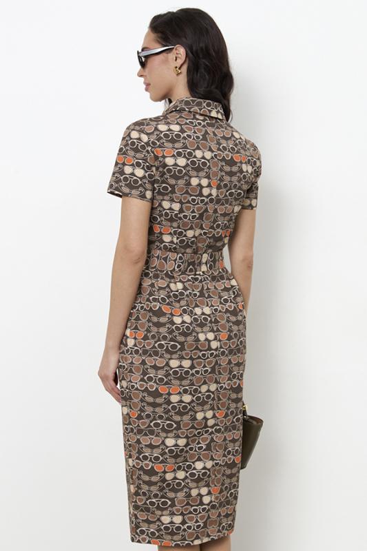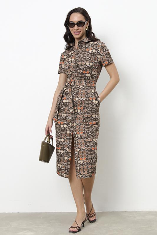 Платье приталенного силуэта из хлопковой плательной ткани. Изделие отрезное по линии талии с защипами. В боковых швах карманы. Втачной короткий рукав. Притачная планка с застёжкой на пуговицы. Вырез горловины обработан отложным воротником на стойке. В комплекте пояс из основной ткани.