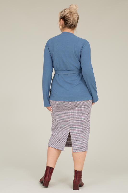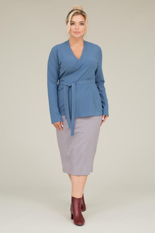 Комплект из юбки и кардигана. Юбка прилегающего силуэта из костюмной ткани. Сзади по среднему шву застёжка-молния, снизу разрез. Пояс притачной. Кардиган из фактурного эластичного полотна. Полуприлегающий силуэт с запахом. Длинный втачной рукав. Вырез горловины оформлены бейкой из основной ткани, переходящий в пояс.