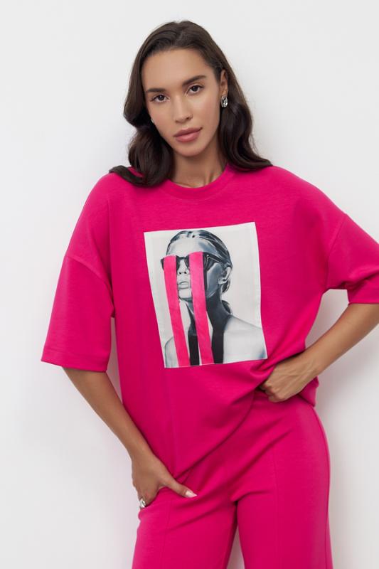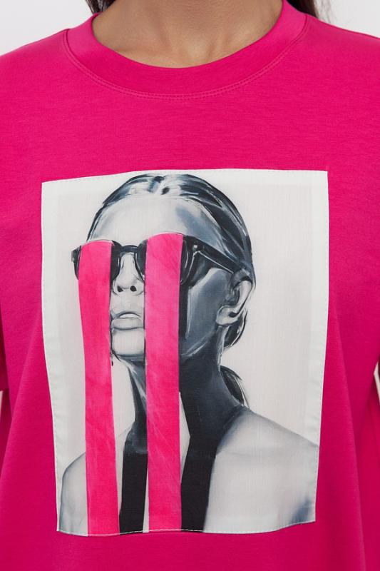 Джемпер свободного силуэта со спущенной линией плеча и рукавом до локтя выполнен из эластичного полотна. Вырез горловины оформлен бейкой из основной ткани. На передней части изделия выполнена аппликация. В таблице размеров представлены параметры человека, а не изделия.