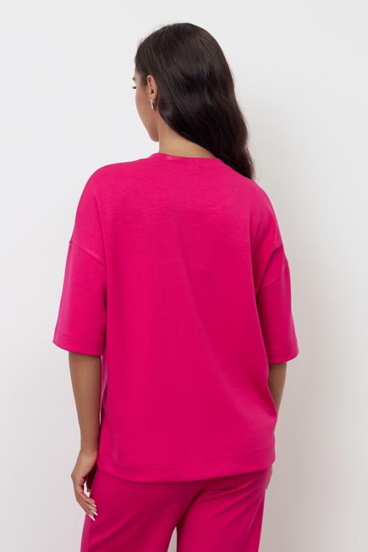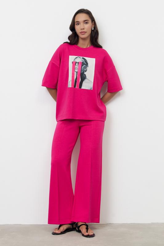 Костюм из эластичного полотна. Джемпер свободного силуэта со спущенной линией плеча и рукавом до локтя. Вырез горловины оформлен бейкой из основной ткани. Брюки прямого силуэта. Пояс с эластичной резиной. На передней части брюк застрочены стрелки.