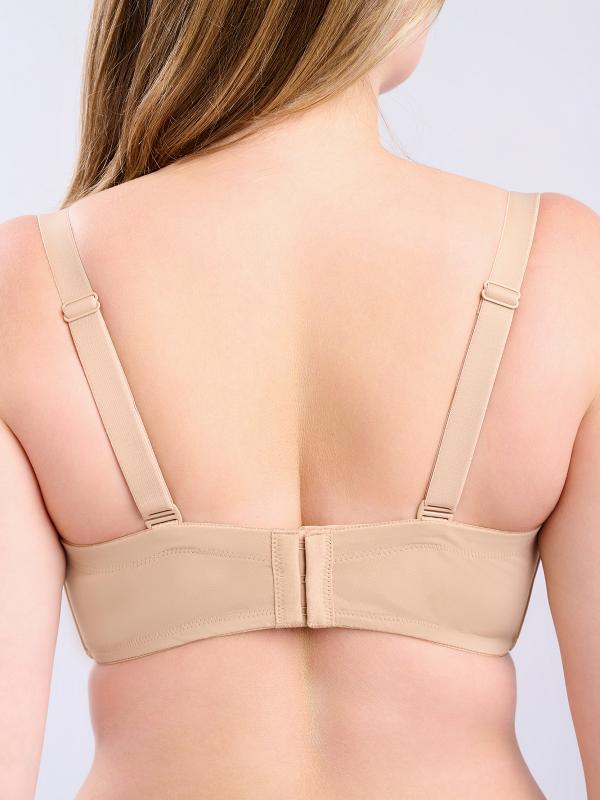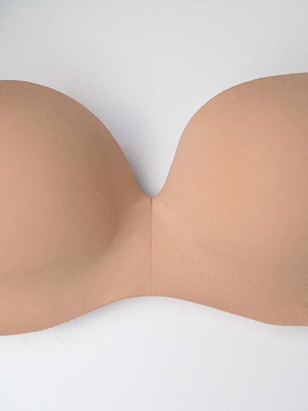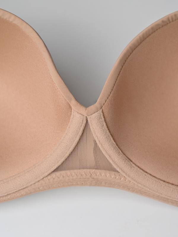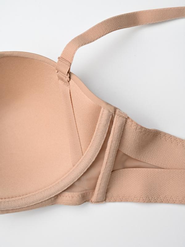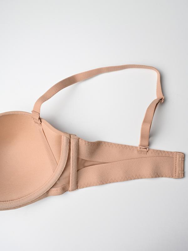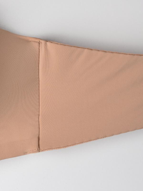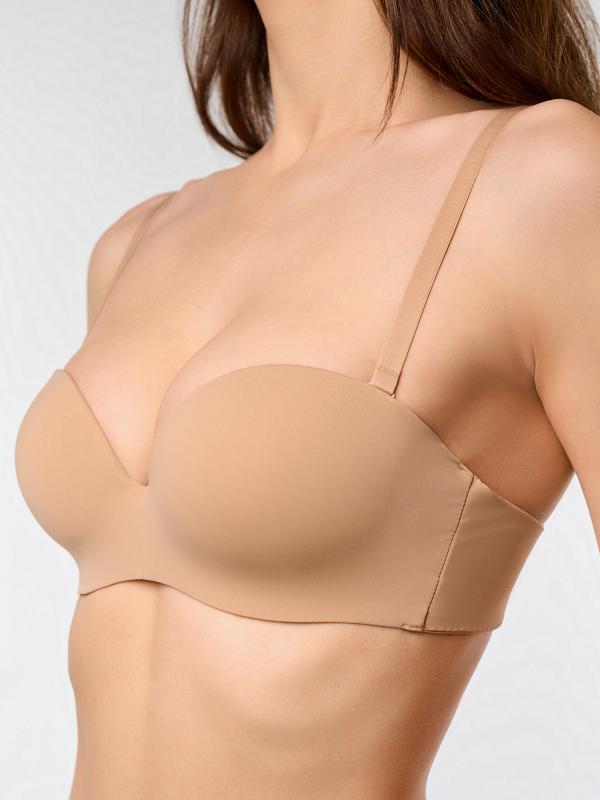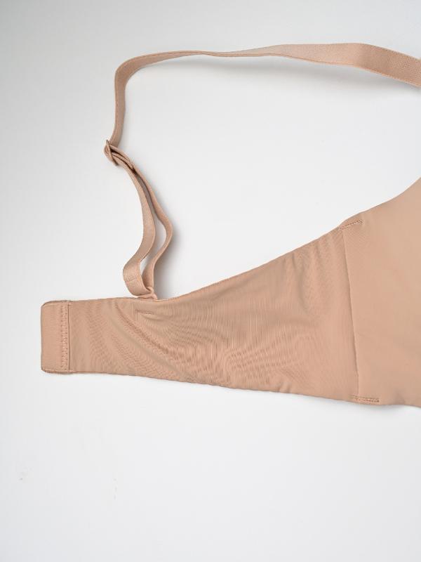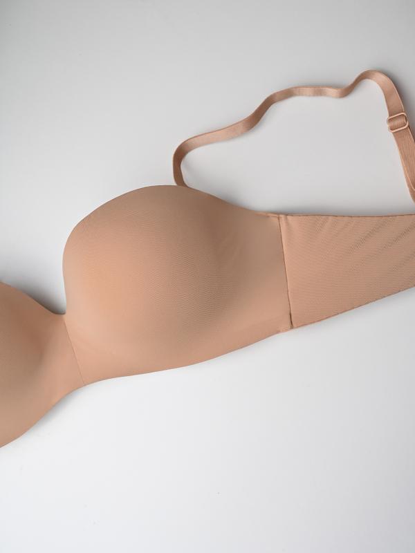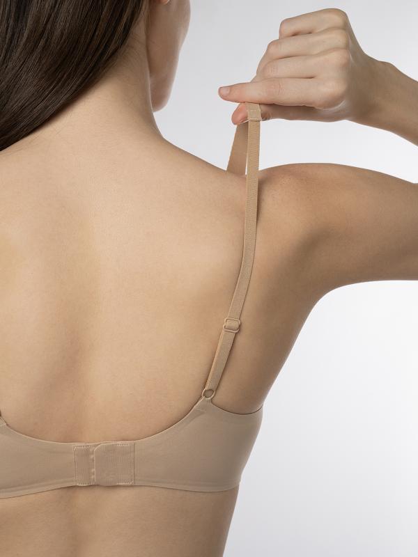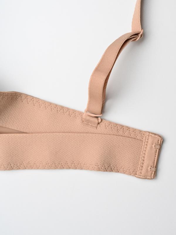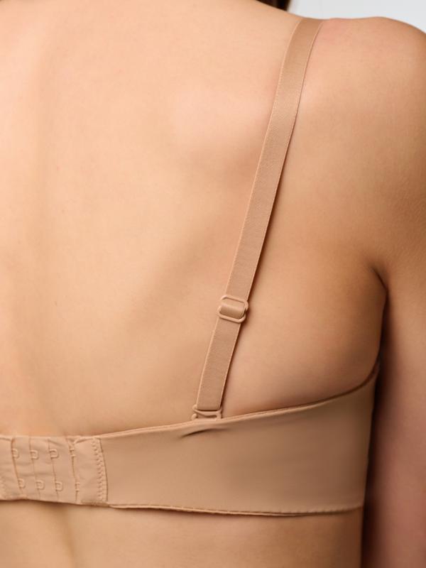 Базовый бюстгальтер без косточек изготовлен из полиамида и выполнен в классическом бежевом цвете. Поролоновые чашки имеют небольшой Push-up, тонкие бретели регулируются. Сзади бюстгальтер застёгивается на крючки.