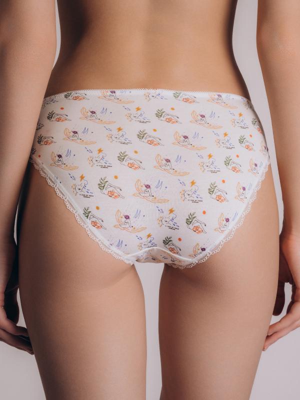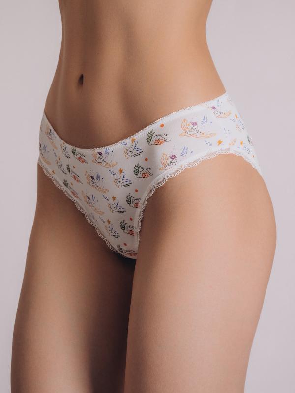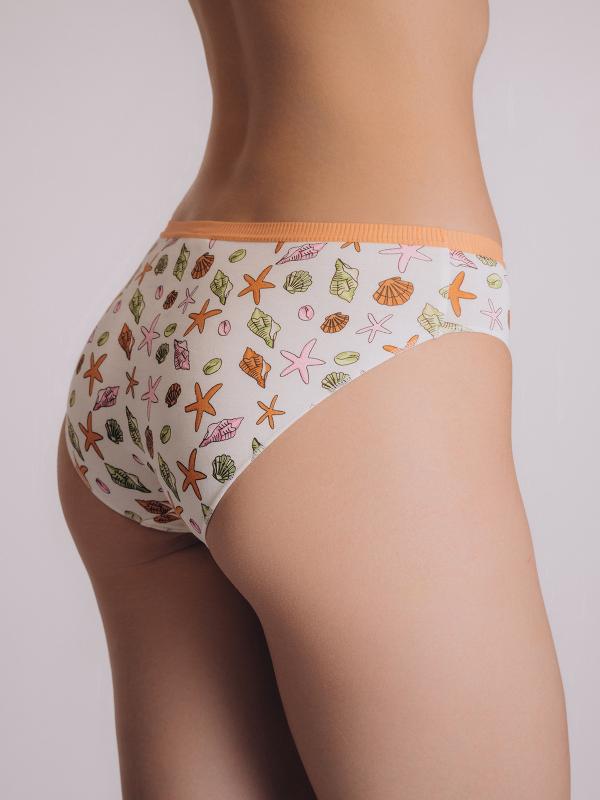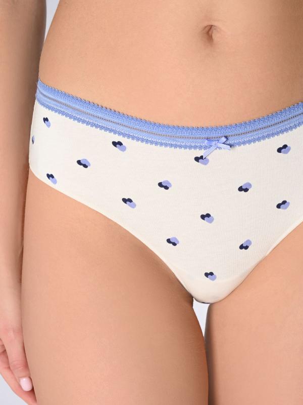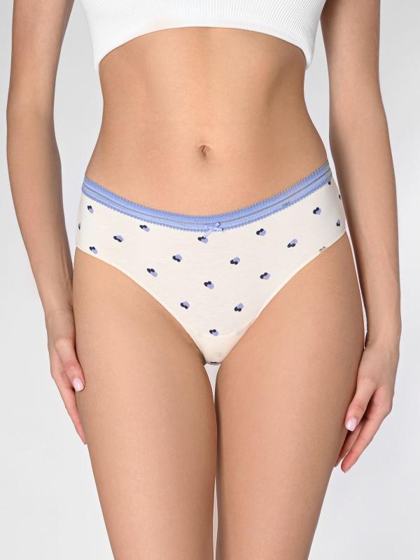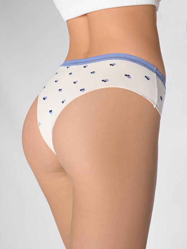 Набор включает трое трусов слипов женских, изготовленных из хлопка и выполненных в белом, бежевом и черном цветах. Трусы имеют среднюю посадку и мягкую резинку на талии, их украшением является принт с изображением пуговиц спереди.