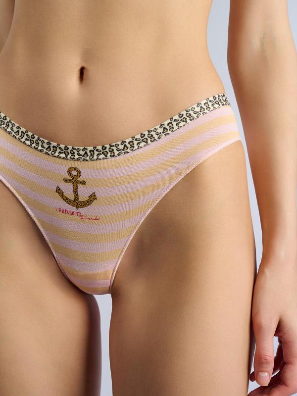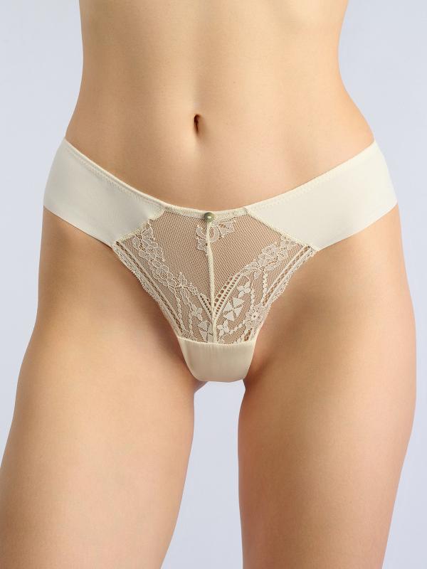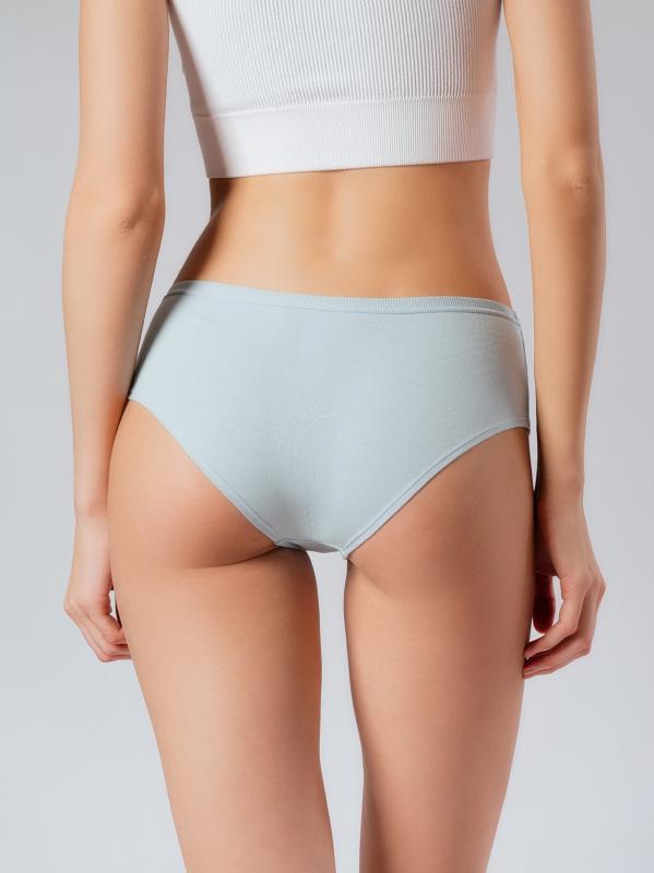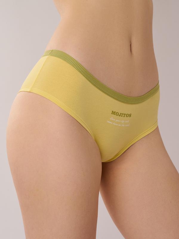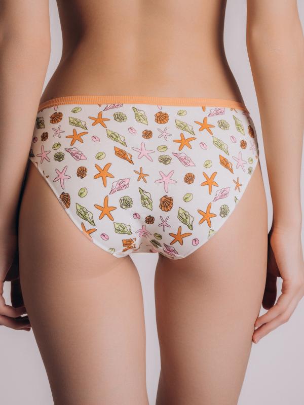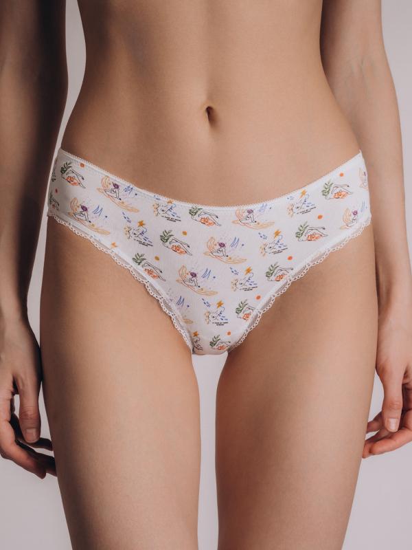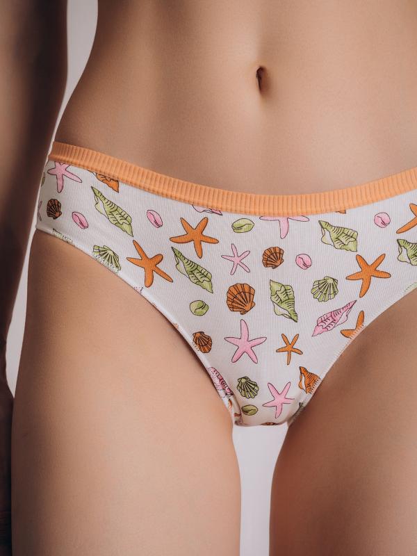 Набор включает трое трусов слипов женских, изготовленных из хлопка и выполненных в белом, бежевом и черном цветах. Трусы имеют среднюю посадку и мягкую резинку на талии, их украшением является принт с изображением пуговиц спереди.