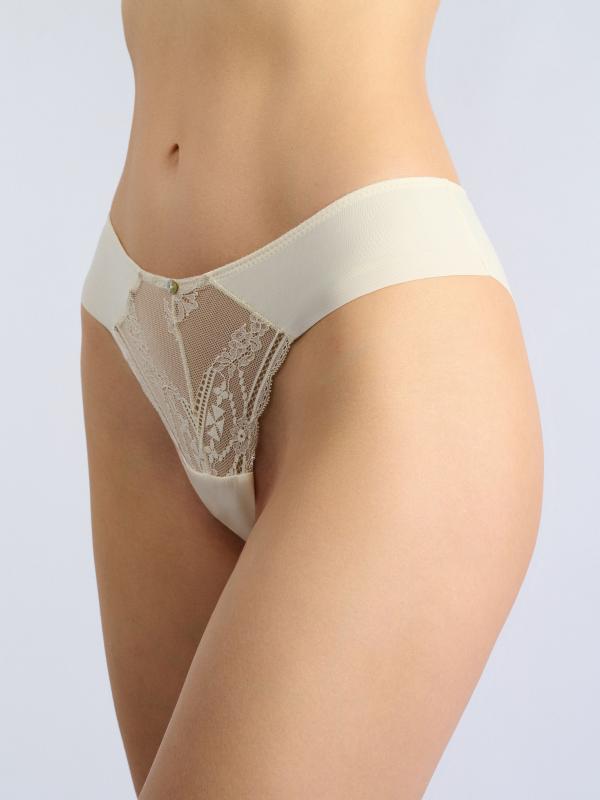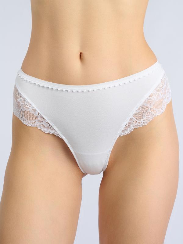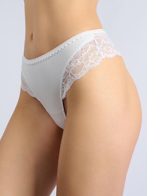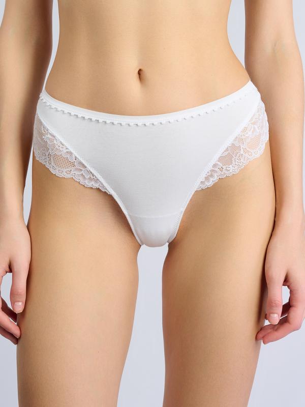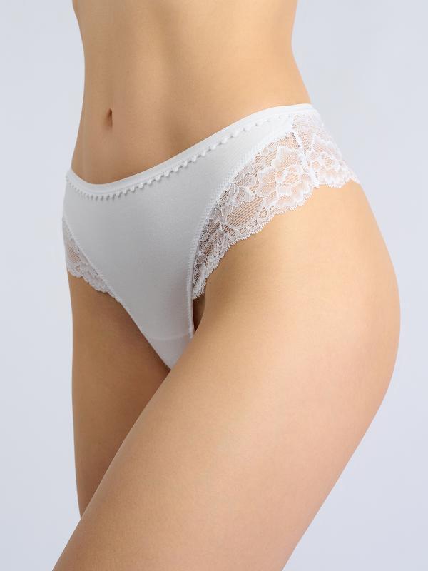 Белые стринги из сочетания хлопка и бамбука. Ажурное кружево плавно переходит с задней части на переднюю, создавая эффект рюшек в передней части.