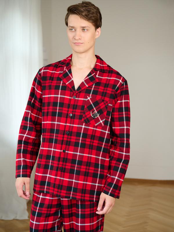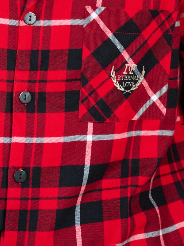 Сорочка в красно-черную клетку, свободного кроя с длинными рукавами и отложным воротником.
