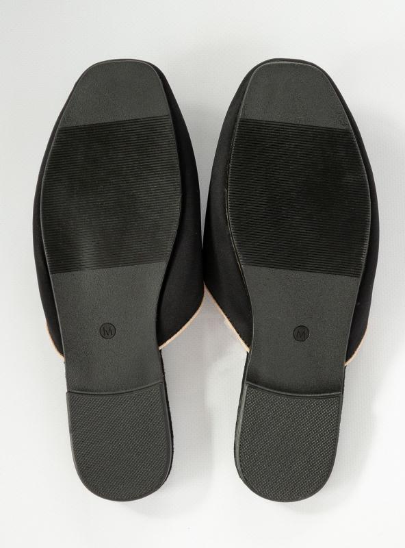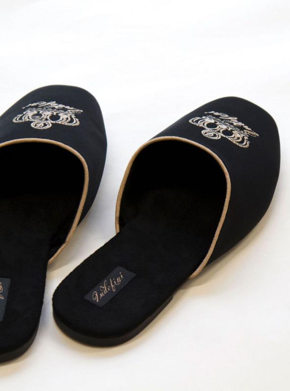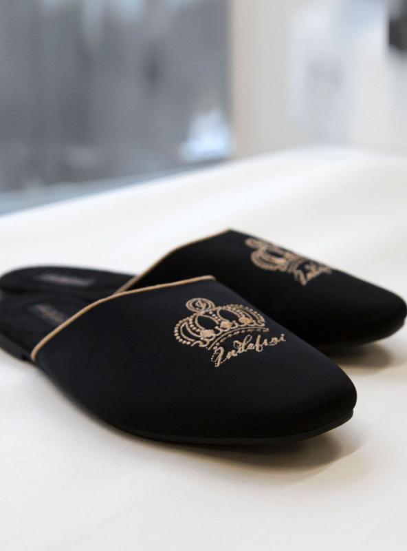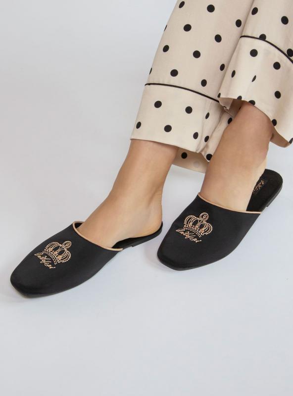 Элегантный черный цвет, мягкая бархатистая текстура и изысканная золотая вышивка в виде короны придают обуви утончённый и роскошный вид. Модель с открытой пяткой, удобной посадкой и плотной подошвой — идеальный выбор для уюта и комфорта в доме.