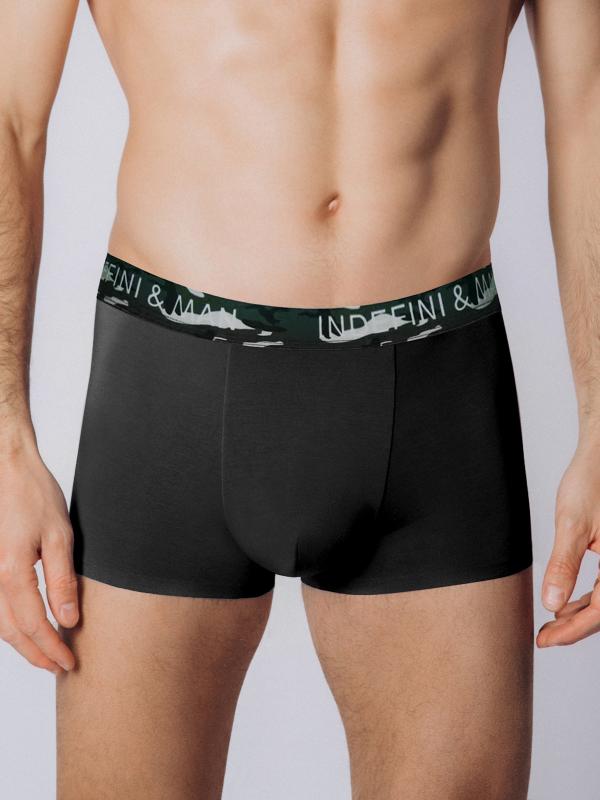 Комфортные и стильные черные боксеры с мягкой резинкой и камуфляжным принтом. Натуральный хлопок, удобная посадка – идеально для повседневной носки.